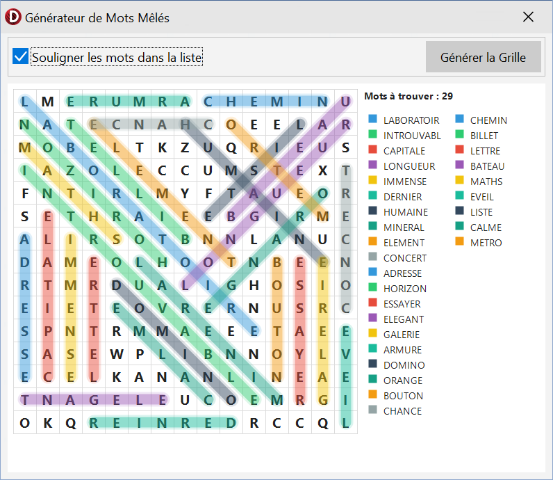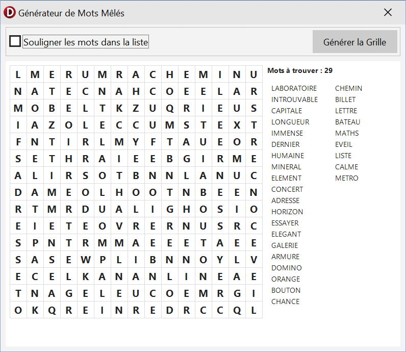 L’application génère une grille de 15 × 15 lettres contenant entre 15 et 30 mots placés aléatoirement dans toutes les directions possibles :