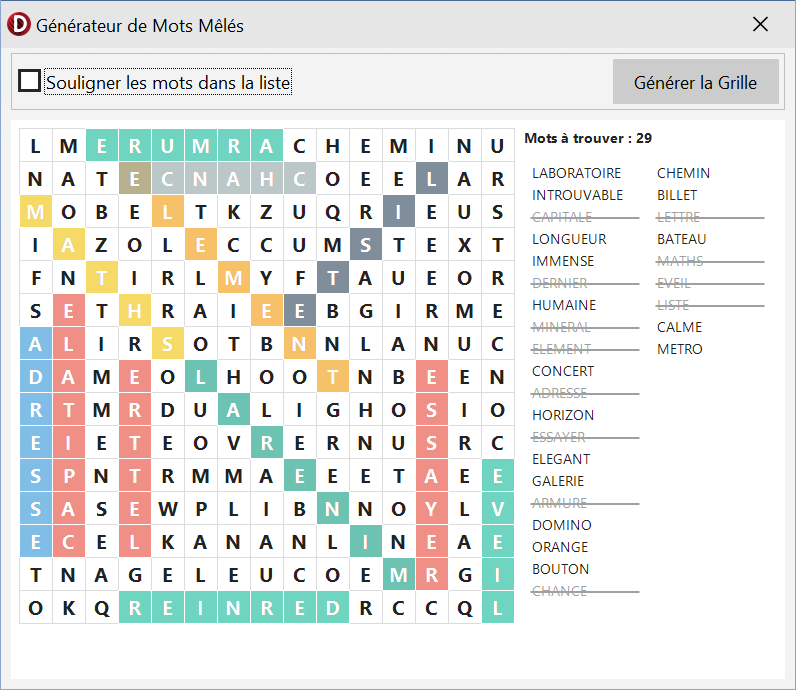 L’utilisateur peut ensuite sélectionner les mots avec la souris, et le programme détecte automatiquement si le mot sélectionné correspond à un mot caché.